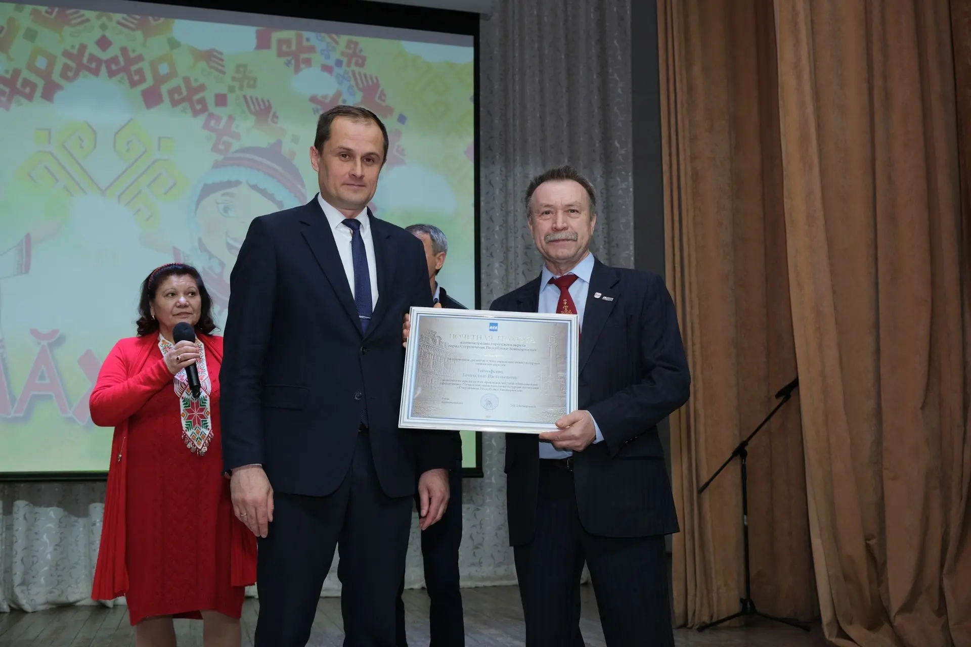 Также Павел Николаевич вручил почётную грамоту от имени главы администрации Э.В. Шаймарданова за сохранение, развитие и популяризацию этнокультурных ценностей народов заместителю председателя правления МОО «Чувашская национально-культурная автономия» г. Стерлитамака Тимофееву Геннадию Васильевичу.