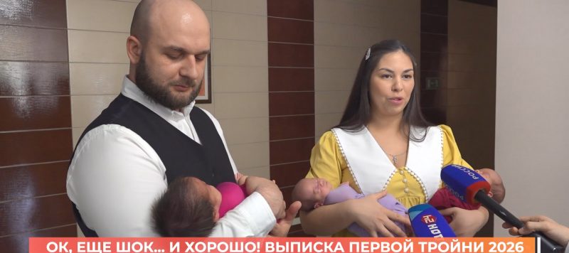 Перинатальный центр выписывает первую тройню 2026-го года рождения. Беременность была непростой, и 6-го марта - на сроке 34 недели и 1 день - пришлось делать экстренное кесарево сечение. Девочки родились с разницей в две минуты: Арина весом два двести, Таисия - та, которая показалась тяжелой старшей сестре - килограмм девятьсот, и Дарина килограмм триста. Месяц и 10 дней малыши провели в центре - дольше всех врачи выхаживали самую маленькую.