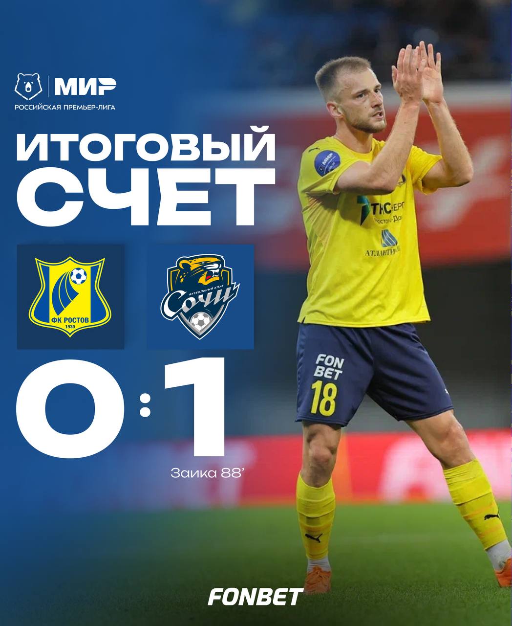 Матч 25го тура Российской премьерлиги между футбольным клубом «Ростов» с «Сочи» завершилась поражением жёлто-синих — сочинцы забили один гол.