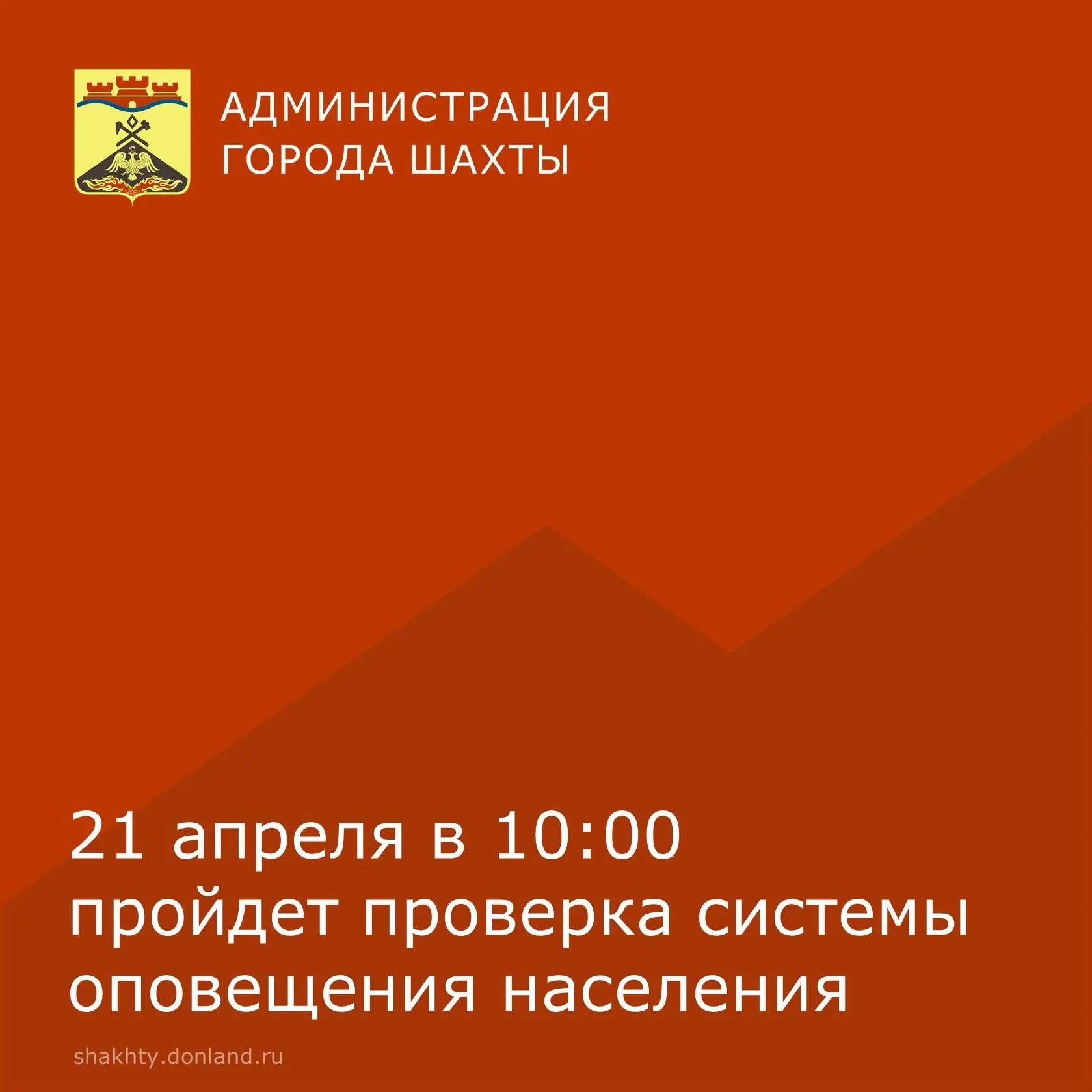 МКУ г. Шахты «Управление по делам ГО ЧС» информирует, что в связи с технической проверкой, 21 апреля 2026 года в 10:00 будет проведен запуск централизованной системы оповещения населения.