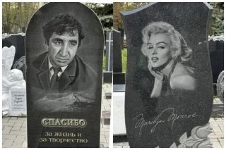 Возле Северного кладбища в Ростове появились надгробия Юрия Никулина, Владимира Высоцкого, Фрунзика Мкртчяна, принцессы Дианы, Мэрилин Монро, Виктора Гюго, Федора Достоевского и других знаменитостей. Таким необычным способом мастерская по изготовлению памятников привлекает внимание к своей продукции.