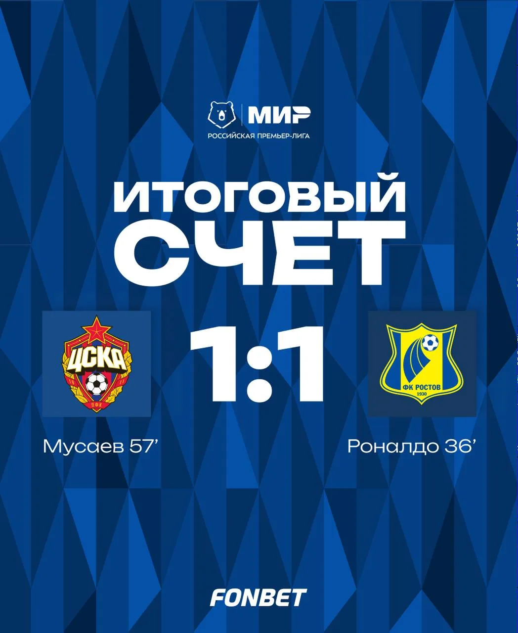 ФК «Ростов» сыграл с московским ЦСКА в 26-м туре Российской премьерлиги на «ВЭБ Арене». Игра завершилась ничьей — 1:1.