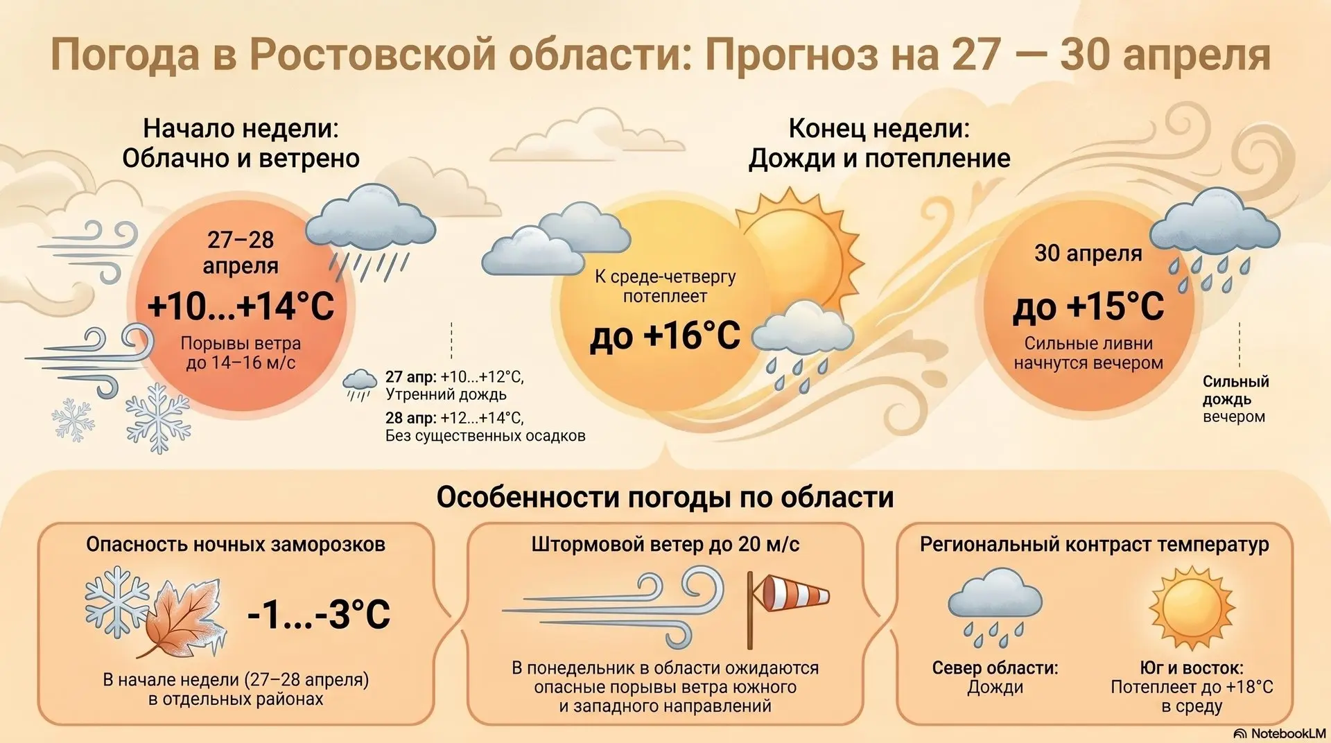 От -3 до +17, дожди и штормовой ветер: какой будет погода в Ростовской области на короткой неделе 27 — 30 апреля