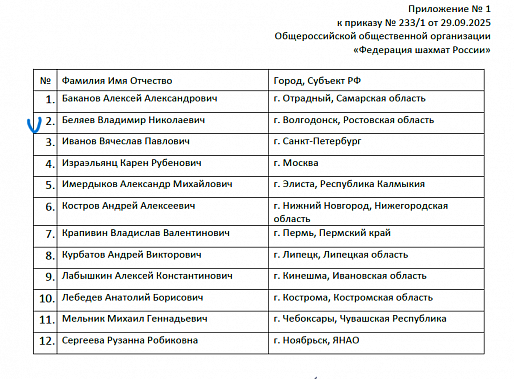 Согласно приказу Федерации шахмат России» № 233/1 от 29 сентября 2025 года за подписью её исполнительного директора А.В. Ткачева квалификационная категория «Спортивный судья всероссийской категории» Владимиру Николаевичу Беляеву продлена по 27 сентября 2029 года! Искренне поздравляем.