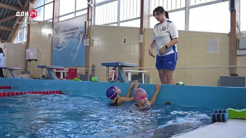 Ростовская область, 5 ноября 2025. Телеканал «ДОН 24». Елена Шехтель работает в бассейне 13-й спортшколы донской столицы уже 7 лет. Плаванием занимаются больше 200 детей, а обучают их 6 тренеров.