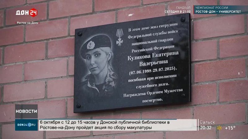 Ростовская область, 4 октября 2025. Телеканал «ДОН 24». Мемориальную доску установили сотруднику Федеральной службы войск национальной гвардии России Екатерине Куликовой. Торжественное памятное мероприятие провели в...