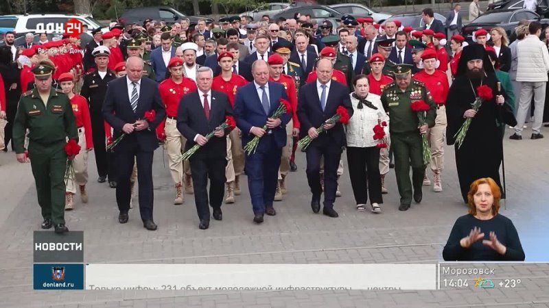 Ростовская область, 19 сентября 2025. Телеканал «ДОН 24». В донской столице почтили память героев Ростова. Представители власти, духовенства, ветераны, молодежь возложили цветы у стелы «Ростов-на-Дону – город воинской славы».
